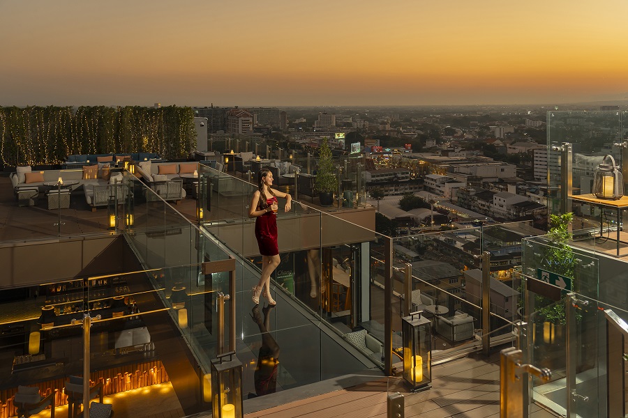 Surrounded by glass balustrades that give way to vistas of Chiang Mai at sunset and by night, the bar is characterised by ambient lighting and contemporary Lanna décor.